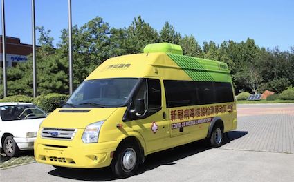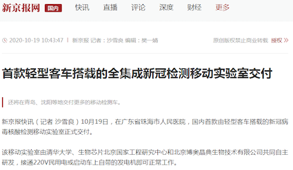 10月19日,“珠海市核酸檢測基地”在廣東省珠海市人民醫(yī)院正式揭牌啟用。揭牌儀式上,由清華大學、生物芯片北京國家工程研究中心和北京博奧晶典生物技術(shù)有限公司共同自主研發(fā)的首款輕型客車搭載的全集成新冠檢測移動實驗室正式亮相。