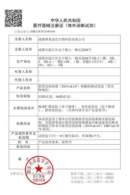 2022年11月4日,博奧晶典新冠病毒核酸檢測(cè)整體解決方案再添新成果,凍干型高靈敏度的新型冠狀病毒(2019-nCoV)核酸檢測(cè)試劑盒 (熒光PCR法)正式獲得醫(yī)療器械注冊(cè)證(國械注準(zhǔn):20223401469)。這是國家藥品監(jiān)督管理局審批通過的首個(gè)凍干型新冠病毒核酸檢測(cè)試劑盒,同時(shí)具備中國NMPA和歐洲CE“雙證”,為堅(jiān)持“動(dòng)態(tài)清零”,全面加強(qiáng)常態(tài)化疫情防控能力建設(shè)提供全新戰(zhàn)疫利器。