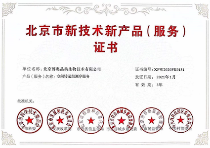 “北京市新技術新產(chǎn)品(服務)認定”旨在推動高新技術產(chǎn)業(yè)的發(fā)展,作為北京市新技術新產(chǎn)品,應擁有自主知識產(chǎn)權,并具有技術先進性和創(chuàng)新性。本次喜獲“空間轉(zhuǎn)錄組測序服務”榮譽證書是各委員會對博奧晶典創(chuàng)新能力的高度贊揚和肯定,同時體現(xiàn)了博奧晶典空間轉(zhuǎn)錄組測序服務在行業(yè)內(nèi)的技術優(yōu)勢。