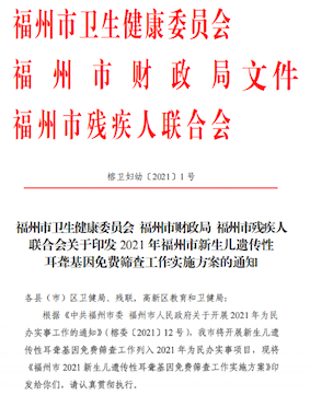 福州市新生兒耳聾基因篩查項(xiàng)目將在5月1日于指定采血機(jī)構(gòu)全面展開,篩查對(duì)象為在福州市指定采血機(jī)構(gòu)出生的常住人口新生兒(篩查對(duì)象需提供父母一方的身份證、戶口簿或居住證復(fù)印件),采用耳聾基因芯片檢測(cè)技術(shù),對(duì)新生兒四個(gè)常見耳聾基因的15 個(gè)突變位點(diǎn)進(jìn)行檢測(cè)。聯(lián)合物理聽力篩查,準(zhǔn)確做出耳聾病因分析,提出早期干預(yù)措施,減少聽力疾病兒童的發(fā)生率,真正實(shí)現(xiàn)“早發(fā)現(xiàn)、早診斷、早干預(yù)”,達(dá)到有效預(yù)防出生缺陷的目標(biāo),減輕家庭和社會(huì)負(fù)擔(dān),促進(jìn)社會(huì)和諧發(fā)展。