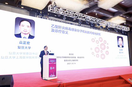 復(fù)旦大學黨委副書記、復(fù)旦大學上海醫(yī)學院黨委書記袁正宏教授作了題為《乙型肝炎病毒感染分子機制的可視化研究及診療意義》的專題報告。報告介紹了研究團隊利用基于 bDNA 的熒光原位雜交結(jié)合免疫熒光技術(shù)及 CRISPR-Tag 活細胞實時熒光失蹤技術(shù),系統(tǒng)性地建立了在體外細胞和組織系統(tǒng)進行原位雜交加熒光、顯色檢測HBV核酸和蛋白可視化的方法。通過可視化技術(shù),研究團隊在亞細胞水平直接觀察到HBV病毒組分,揭示了HBV病毒部分關(guān)鍵復(fù)制環(huán)節(jié)的細節(jié),填補了HBV生活史一些關(guān)鍵環(huán)節(jié)的時空信息。在組織水平觀察到病毒核酸與蛋白的分布特征,反應(yīng)肝臟內(nèi)HBV病毒的生活特征。課題組開發(fā)的可視化技術(shù)可以用來監(jiān)測慢乙肝患者抗病毒治療后病毒蛋白質(zhì)和核酸,尤其 cccDNA 的清除情況,有助于臨床醫(yī)生制訂更好的治療方案,并可為指導(dǎo)開發(fā)新藥物提供幫助。