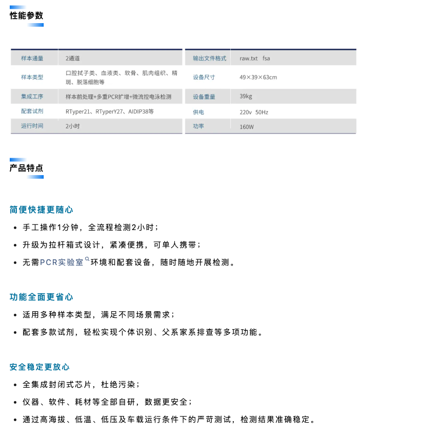 該設(shè)備采用拉桿箱式設(shè)計(jì),可由單人攜帶使用,適用于戶外、車載、高原環(huán)境等,是國(guó)際首款“可移動(dòng)法醫(yī)DNA實(shí)驗(yàn)室”,為全球公共安全部門(mén)在現(xiàn)場(chǎng)物證檢驗(yàn),重點(diǎn)人員篩查、重大公共安全事件的快速處置、出入境邊防檢查等應(yīng)用場(chǎng)景增添強(qiáng)勁利器。